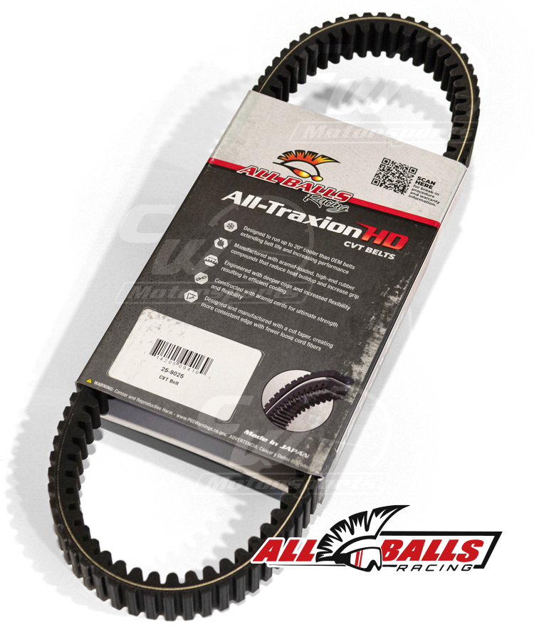 All Balls Racing belts are engineered to run up to 20 degrees cooler, proven in washout comparative testing, and built to go the distance. Deeper cogs and increased flexibility reduce rigidity and heat build-up, while high-end Japanese rubber components and high-strength aramid cords and fibers keep you gripping and moving forward. The Cut Taper manufacturing process delivers a cleaner, more consistent edge with fewer loose cord fibers than Ground Taper alternatives. Experience Less Downtime, and More Riding!
